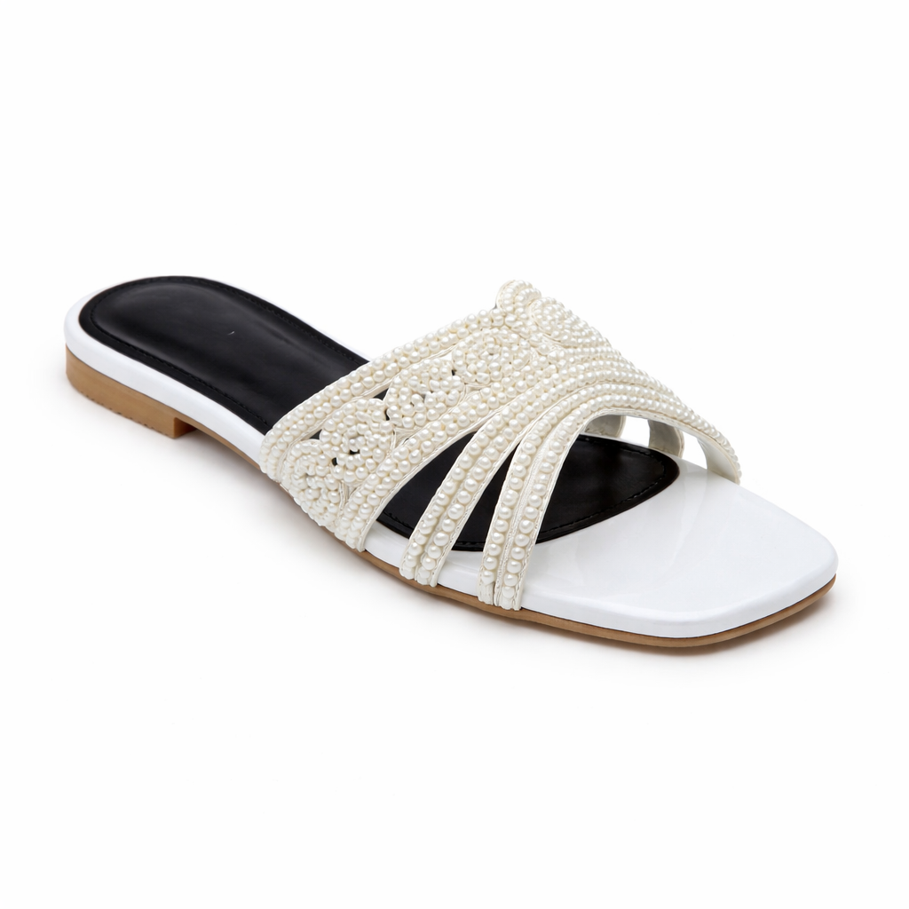 The Sylva Wear Breeze Bound Flats are designed for women who love graceful simplicity with a touch of luxury. These elegant flat sandals feature beautifully wrapped multi-layered pearl bead straps that create a refined, soft, and feminine look. The clean square-toe base adds a modern silhouette, making these sandals perfect for both casual wear and elegant occasions.